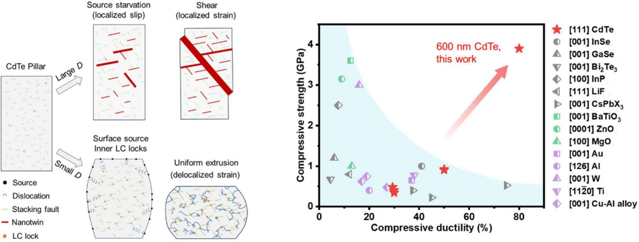 碲化镉(CdTe)是第二代光电半导体的代表,广泛应用于太阳能电池、探测器等领域。团队通过原位微纳力学测试发现,其单晶纳米柱在室温下可实现超过4 GPa的极限抗压强度与高达80%的压缩应变,且样品无裂纹与剪切带产生,性能远超多数半导体、陶瓷乃至金属。微纳尺度实验表征和计算模拟研究其机理表明,表面发射的全位错与位错锁相互作用,可形成位错网络,从而有效促进加工硬化并实现应变去局域化。团队进一步基于格里菲斯断裂和位错形核理论,提出了全新的变形判据,为筛选潜在韧性半导体提供了理论依据。