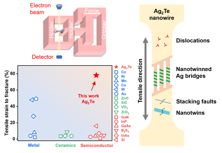 长期以来,研究人员致力于开发能够将温差直接转化为电能的热电器件。传统无机热电半导体虽具备良好的热电性能,却因强离子/共价键作用而存在本征脆性,制约其实际应用。为克服这一瓶颈,研究团队通过微纳加工技术制备Ag2Te纳米线,实现高达75.7%的拉伸断裂应变,展现出优异的室温延展性。研究发现,其超高拉伸延展性源于多种变形机制的协同作用,包括位错滑移、层错形成以及变形孪晶。随着应变进一步增大,断口附近析出的纳米孪晶银桥可有效抑制裂纹扩展。该研究揭示了Ag2Te在纳米尺度下的力学行为与变形机制,为柔性微器件的可靠性设计奠定了理论基础。