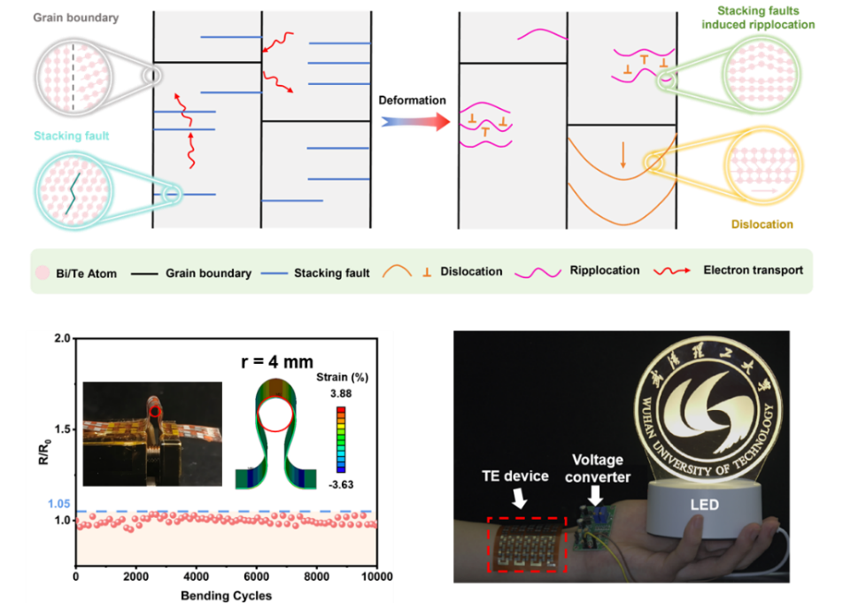 碲化铋作为一种具有优异热电性能的半导体材料,其低强度与本征脆性严重制约了在微型及可穿戴器件中的应用。针对这一难题,研究团队采用界面工程策略,成功制备出具有高密度层错的纳米晶碲化铋薄膜。该材料展现出优异的综合性能:屈服强度达363 MPa,拉伸断裂应变达7.3%和高功率因子。研究团队建立了纳米晶碲化铋薄膜的强化-软化理论模型,揭示了柱状约束层与层错诱导的扭折结构是实现强度与韧性协同提升的关键机制。基于这一策略开发的碲化铋柔性热电薄膜器件,在经历10,000次弯曲后电阻增长小于5%,同时可实现高电压和功率输出,展现出优异的力学可靠性与广阔的应用前景。