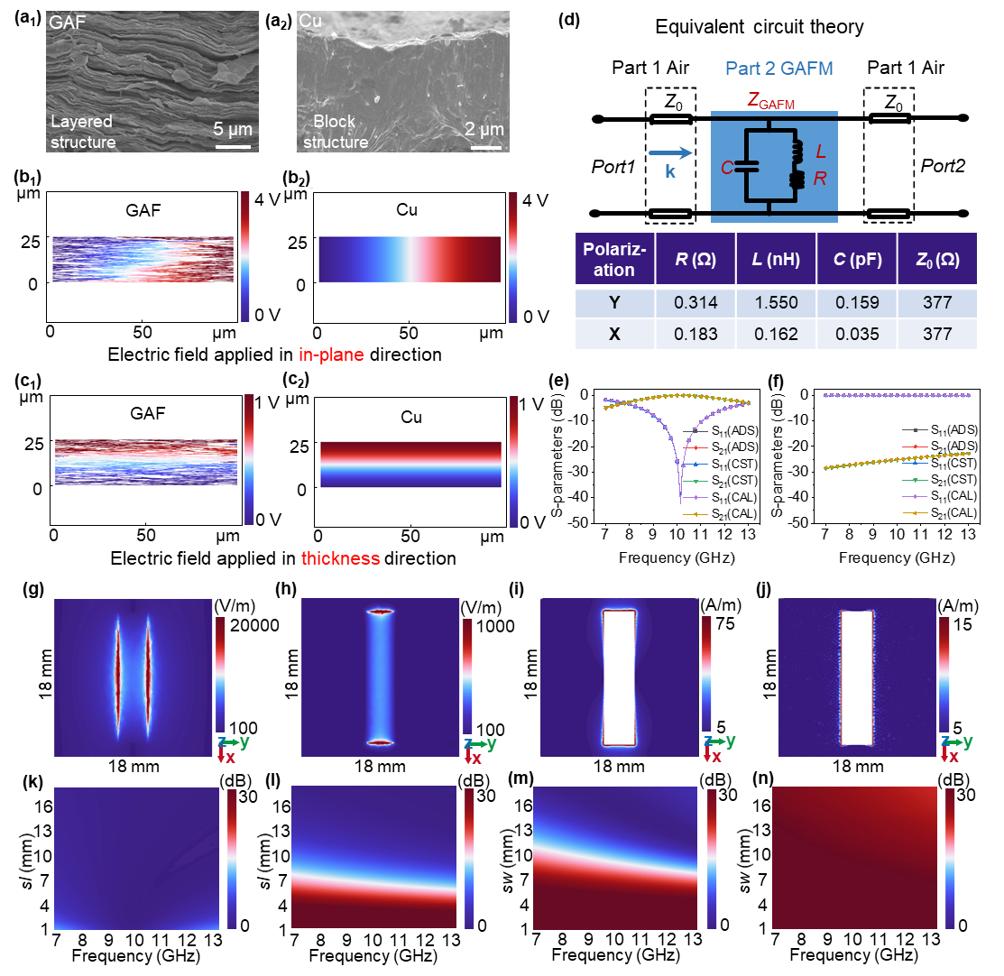 基于团队前期关于激光诱导石墨烯电磁超表面、定向碳纤维电磁操控材料等研究(National Science Review, 2025, 12(11): nwaf395Small, 2025, 21(16): 2408366),研究团队创新性地开发了一种高导电性的石墨烯膜超材料(GAFM),能够实现电磁屏蔽效能的极化操控,利用等效电路的碳基材料推广,使得简单的旋转操作即可在“开”和“关”状态间连续切换(图1)。为了进一步扩大EMI SE的操控范围(ΔEMI SE),该工作将碳纤维CFGAFM复合。通过采用两者相互平行和垂直2种模式,分别实现极化差异增强和全极化屏蔽。该工作将经典电磁等效电路理论由传统金属材料扩展到具有微观结构的先进碳材料(图2),不仅揭示了先进碳材料在电磁屏蔽中的机制及其极化操控原理,还达到了最宽的极化差异操控范围(极化敏感性增强至1061.60 dB/mm)、最高的全极化屏蔽效率(超过99.15%)以及最显著的状态切换效率范围(3.17%-99.79%)。这一成果为电磁响应的动态操控提供了新思路,也为智能电磁屏蔽材料的发展奠定了基础,以满足复杂高保真电磁防护系统、自主伪装装置和未来智能生活环境的需求。