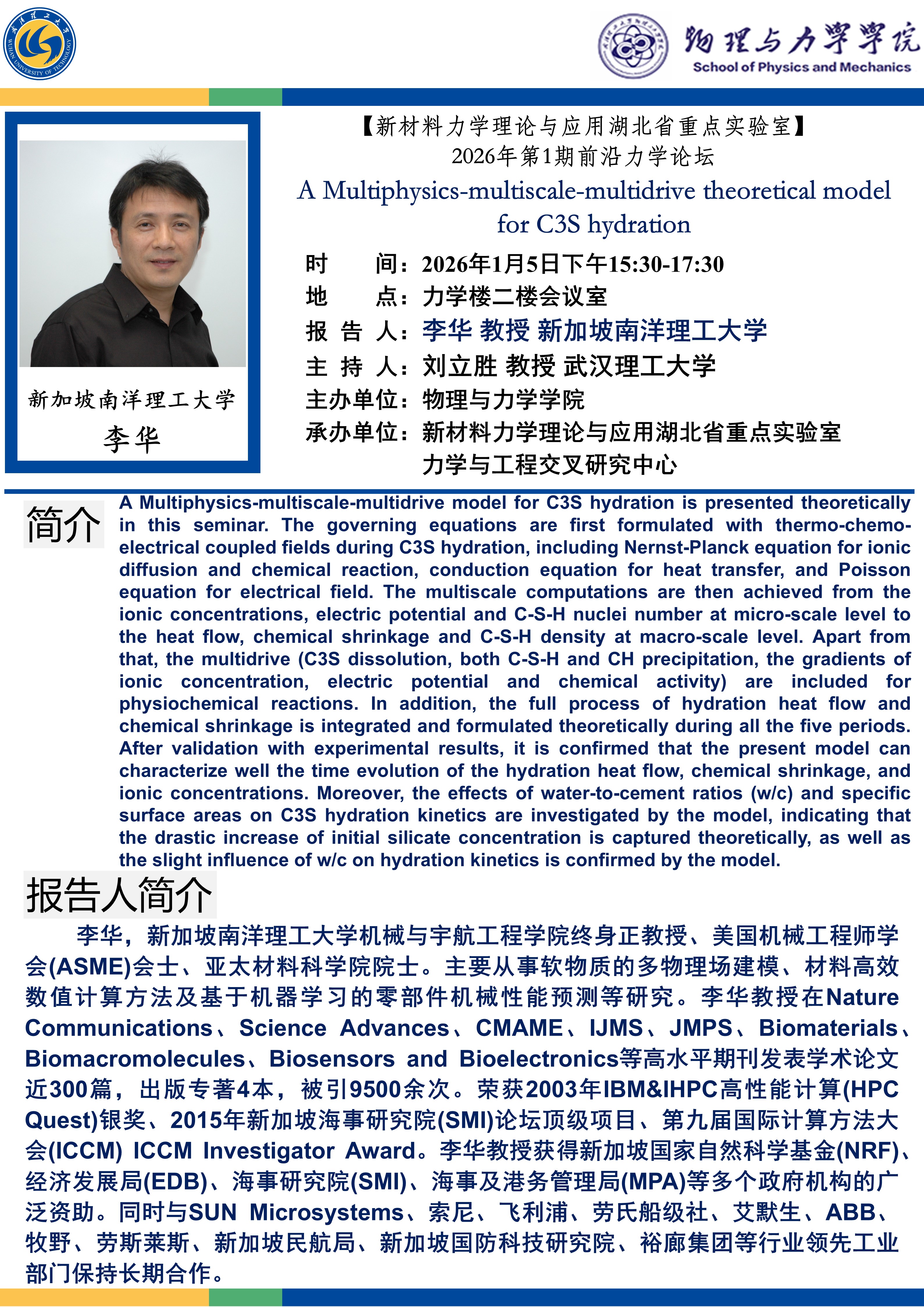 【必赢3003no1线路检测中心】南洋理工大学李华教授讲座 A Multiphysics-multiscale-multidrive theoretical model for C3S hydration 发布时间:2026-01-05