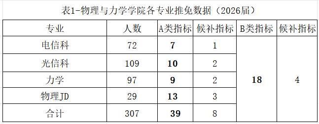 1.A类推免生共39名,B类推免生共18名。我们按照各专业2026年应届毕业生人数比例,将26个A类推免生名额分配到各专业,13个A类推免生名额分配到物理实验班,见下表表1。